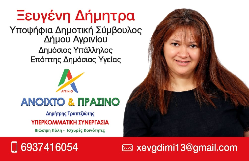 Σε μήνυμά της η Δήμητρα Ξευγένη αναφέρει “Αγαπητοί συνδημότες και συνδημότισσες ζητώ τη δική σας ψήφο εμπιστοσύνης για να δημιουργήσουμε όλοι μαζί έναν ζηλευτό, ανεξάρτητο και πρωτοπόρο Δήμο, δίπλα στον νομομαθή και ικανό υποψήφιο Δήμαρχο κ. Δημήτρη Τραπεζιώτη, που με συνέπεια λόγου και έργου όπως έχει αποδείξει και στο παρελθόν αποβλέπει στη βέλτιστη ποιότητα της ζωής των πολιτών του Δήμου Αγρινίου. Ας στηρίξουμε λοιπόν όλοι με το ίδιο πάθος την καλύτερη επιλογή για τον τόπο μας!”