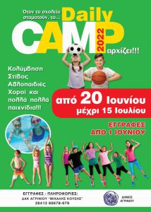Συνεχίζονται έως τις 15 Ιουλίου οι εγγραφές για συμμετοχή στο Daily Camp 2022 που διοργανώνεται στο Δημοτικό Αθλητικό Κέντρο Αγρινίου «Μιχάλης Κούσης».