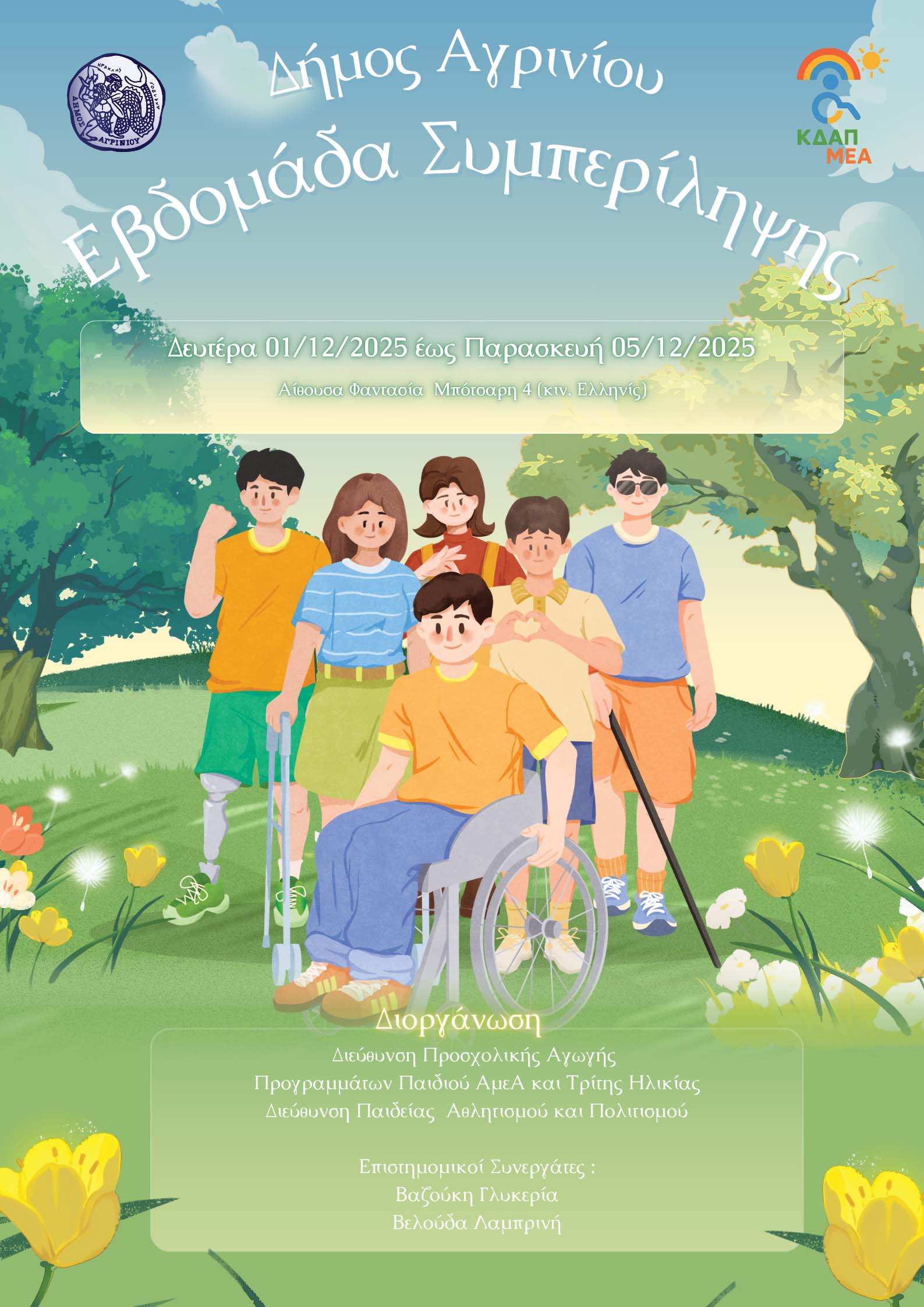 Ο Δήμος Αγρινίου, μέσω της Διεύθυνσης Προσχολικής Αγωγής, Προγραμμάτων Παιδιού, ΑμεΑ και Τρίτης Ηλικίας, σε συνεργασία με τη Διεύθυνση Παιδείας, Πολιτισμού και Αθλητισμού, διοργανώνει από την 1η έως και την 5η Δεκεμβρίου την «Εβδομάδα Συμπερίληψης», μια δράση αφιερωμένη στην προώθηση της ισότητας, του σεβασμού, της αποδοχής και της ουσιαστικής ένταξης κάθε παιδιού, ανεξαρτήτως ικανοτήτων.