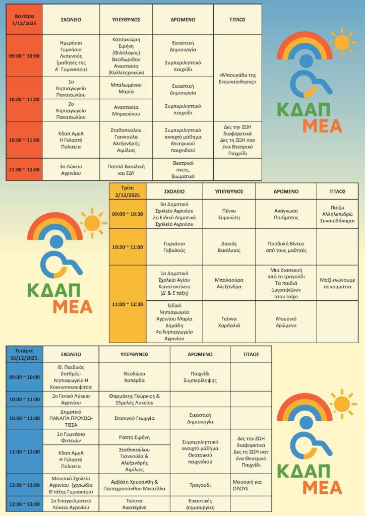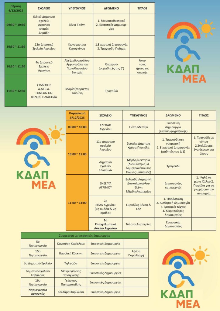 Οι εκδηλώσεις θα πραγματοποιηθούν στην Αίθουσα “Φαντασία” (Μπότσαρη 4, κινηματογράφος Ελληνίς) και περιλαμβάνουν ένα πλούσιο πρόγραμμα δράσεων, που στοχεύουν στην ενημέρωση, την ενδυνάμωση και την καλλιέργεια συμπεριληπτικής κουλτούρας στην καθημερινή ζωή.