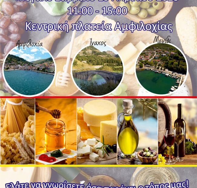 Ο Δήμος Αμφιλοχίας και η Περιφέρεια Δυτικής Ελλάδας σας προσκαλούν σεέκθεση τοπικών προϊόντωνστην κεντρική πλατεία Αμφιλοχίας, το Μεγάλο Σάββατο 15 Απριλίου 2023, από τις 11:00 έως τις 15:00.