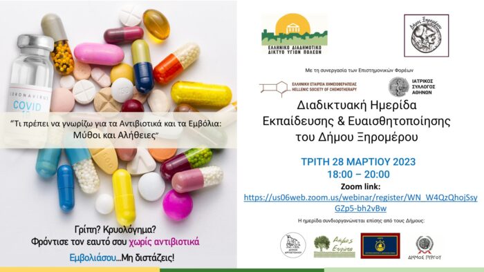 Ο Δήμος Ξηρομέρου σε συνεργασία με τους Δήμους Αργοστολίου, το Δήμο Ευρώτα, το Δήμο Πύργου και το Δήμο Κεντρικής Κέρκυρας & Διαποντίων Νήσων, διοργανώνει διαδικτυακή ημερίδα με θέμα: «Μύθοι & Αλήθειες για τα Αντιβιοτικά & τα εμβόλια» την Τρίτη 28 Μαρτίου και ώρα 06:00 – 08:00 μ.μ.