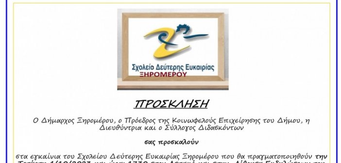 Ο Δήμαρχος Ξηρομέρου, ο Πρόεδρος της Κοινωφελούς Επιχείρησης του Δήμου, η Διευθύντρια και ο Σύλλογος Διδασκόντων σας προσκαλούν στα εγκαίνια του Σχολείου Δεύτερης Ευκαιρίας Ξηρομέρου, που θα πραγματοποιηθούν την Τετάρτη 4/10/2023 και ώρα: 17.30 στον Αστακό, στην Αίθουσα Εκδηλώσεων του Δημαρχείου Ξηρομέρου.