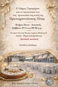 Ο Δήμος Ξηρομέρου και το προσωπικό του, σας προσκαλεί στη κοπή της Πρωτοχρονιάτικης Πίτας.