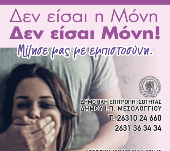 Τηλεφώνησε και μίλησε Εμπιστευτικάστις Κοινωνικές Υπηρεσίες του Δήμου Ιερής Πόλης Μεσολογγίου(26310 24660, 2631363434) ή στο Γραφείο Αντιμετώπισης Ενδοοικογενειακής Βίαςτου Αστυνομικού Τμήματος Μεσολογγίου (26314 40055, 26314 40056, όλο το 24ωρο/7 ημέρες την εβδομάδα)όπως και στην Πανελλαδική Γραμμή15900.