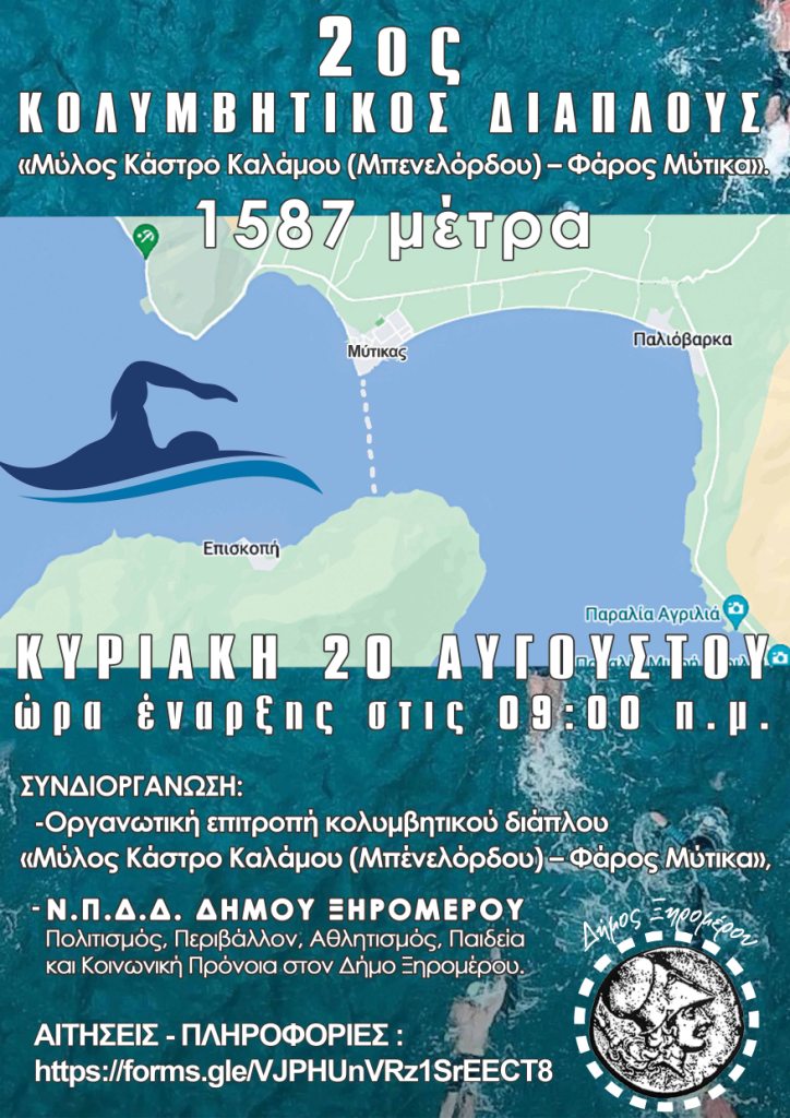 Το Νομικό Πρόσωπο «Πολιτισμός, Περιβάλλον και Αθλητισμός, Παιδεία και Κοινωνική Πρόνοια στον Δήμο Ξηρομέρου», με την βοήθεια της οργανωτικής επιτροπής κολυμβητικού διάπλου «Μύλος Κάστρο Καλάμου (Μπένελόρδου) – Φάρος Μύτικα», ανακοινώνουν την διεξαγωγή του 2ου κολυμβητικού διάπλου, την Κυριακή 20 Αυγούστου.