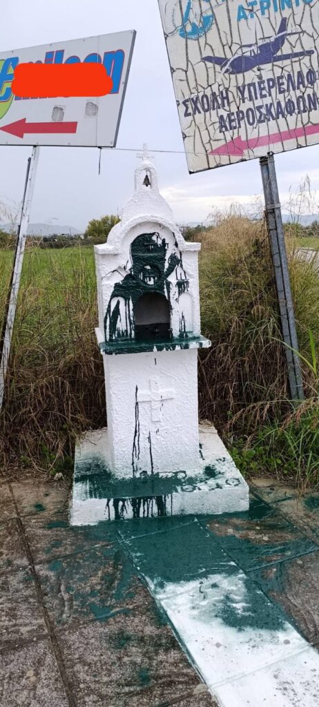 Aγανάκτηση ένιωσα πριν λίγο αντικρίζοντας τον βανδαλισμό σε αυτό το μικρό εικονοστάσι που βρίσκεται σε κεντρικό δρόμο της περιοχής μας.Κάποιος, χωρίς ίχνος σεβασμού, το κατέστρεψε με μπογιά, προσβάλλοντας όχι μόνο το θρησκευτικό σύμβολο, αλλά και όλους εμάς που το θεωρούμε κομμάτι της πίστης μας.Ανεξάρτητα από τις πεποιθήσεις του καθενός, τέτοιες πράξεις ασέβειας δεν έχουν θέση σε μία πολιτισμένη κοινωνία. Ο σεβασμός προς τα ιερα, την πίστη και τα σύμβολα των άλλων είναι δείγμα παιδείας και άνθρωπιάς και έχουμε όλοι υποχρέωση να φροντίζουμε, να προστατεύουμε αυτά τα μικρά σημεία μνήμης που στολίζουν τους δρόμους .