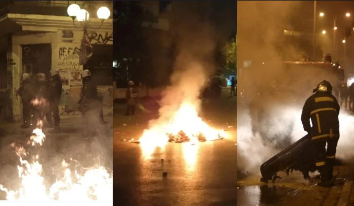 20:26 – Επεισόδια σημειώθηκαν όταν η Κεφαλή της πορείας κατευθυνόταν από την Εμμανουήλ Μπενάκη προς τα Εξάρχεια, με κουκουλοφόρους να ανάβουν φωτιές σε κάδους απορριμμάτων.