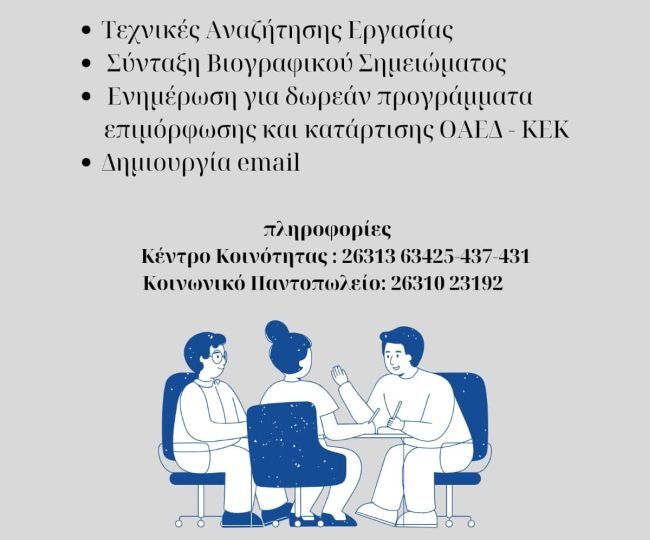 Η υπηρεσία της παροχής δωρεάν συμβουλών υλοποιείται με πρωτοβουλία του Αντιδημάρχου Κοινωνικής Προστασίας Δημήτρη Ράπτη και απευθύνεται σε ευπαθείς ομάδες του Δήμου μας(μονογονεϊκές οικογένειες, άτομα που ανήκουν σε διαφορετικές φυλετικές και θρησκευτικές ομάδες όπως μετανάστες, παλιννοστούντες και πρόσφυγες, άτομα με πολιτισμικές ιδιαιτερότητες, όπως ROMΑ) αλλά και σε όλου όσους έχουν ανάγκη υποστήριξης για την παρουσίαση των δεξιοτήτων τους.