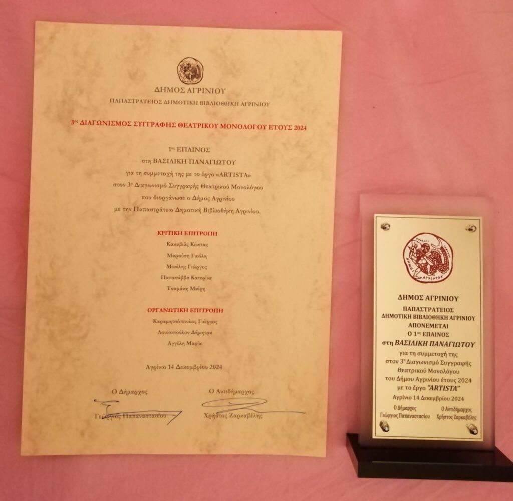 Το Σάββατο 26/4 το μεσημέρι υποδεχτήκαμε στην αίθουσα συνεδριάσεων του Δημοτικού Συμβουλίου Αγρινίου τους νικητές του 3ου διαγωνισμού συγγραφής θεατρικού μονολόγου 2024 που διοργάνωσε ο Δήμος Αγρινίου με την Παπαστράτειο Δημοτική Βιβλιοθήκη Αγρινίου. Σε μια όμορφη και συγκινητική εκδήλωση έγιναν οι απονομές ενώ η ηθοποιός Γιούλη Μαρούση διάβασε αποσπάσματα των έργων που βραβεύθηκαν.