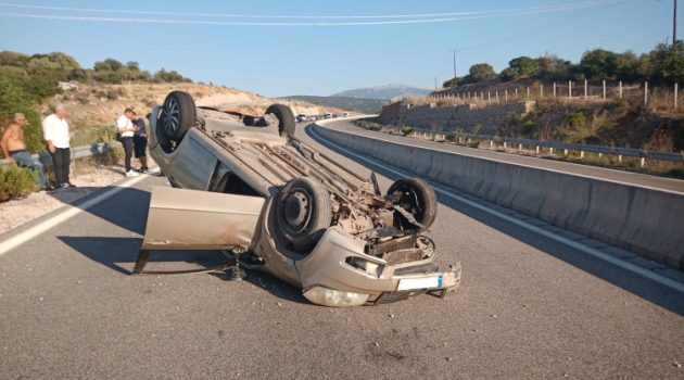 Το αυτοκίνητο για άγνωστο λόγο έφυγε από την πορεία και χτύπησε στο στηθαίο με αποτέλεσμα την ανατροπή του.