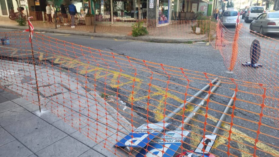 Οδός Δαγκλή σκαμμένη, διέλευση μετ’ εμποδίων για πεζούς και οχήματα.