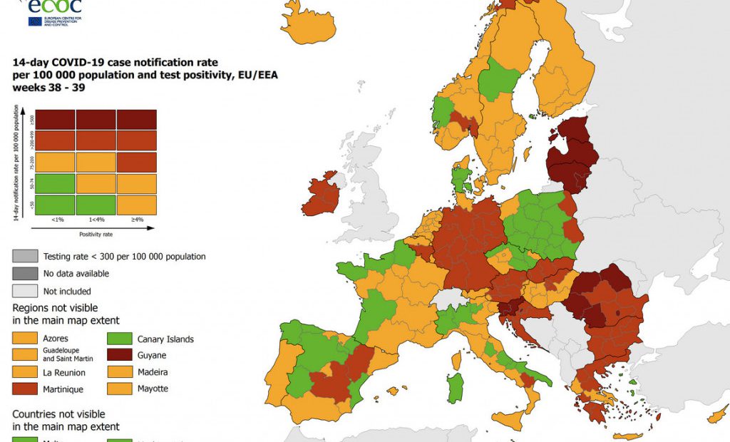 Περισσότερες περιοχές μπήκαν στο κίτρινο σε σχέση με την προηγούμενη εβδομάδα σύμφωνα με τα νέα επικαιροποιημένα στοιχεία του Ευρωπαϊκού Κέντρου Πρόληψης και Ελέγχου Νόσων (ECDC), που παρουσιάστηκαν σήμερα 7 Οκτωβρίου.
