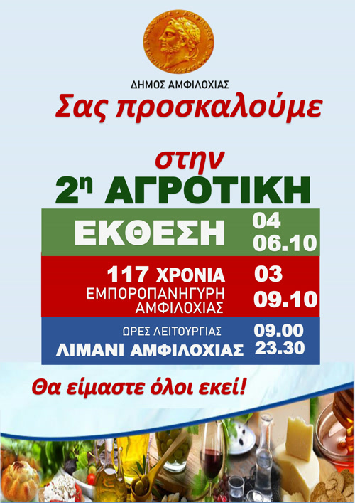 Σας προσκαλούμε στην 2η ΑΓΡΟΤΙΚΗ ΕΚΘΕΣΗ 04 – 06.10 και  117 ΧΡΟΝΙΑ ΕΜΠΟΡΟΠΑΝΗΓΥΡΗ ΑΜΦΙΛΟΧΙΑΣ 03 – 09.10
