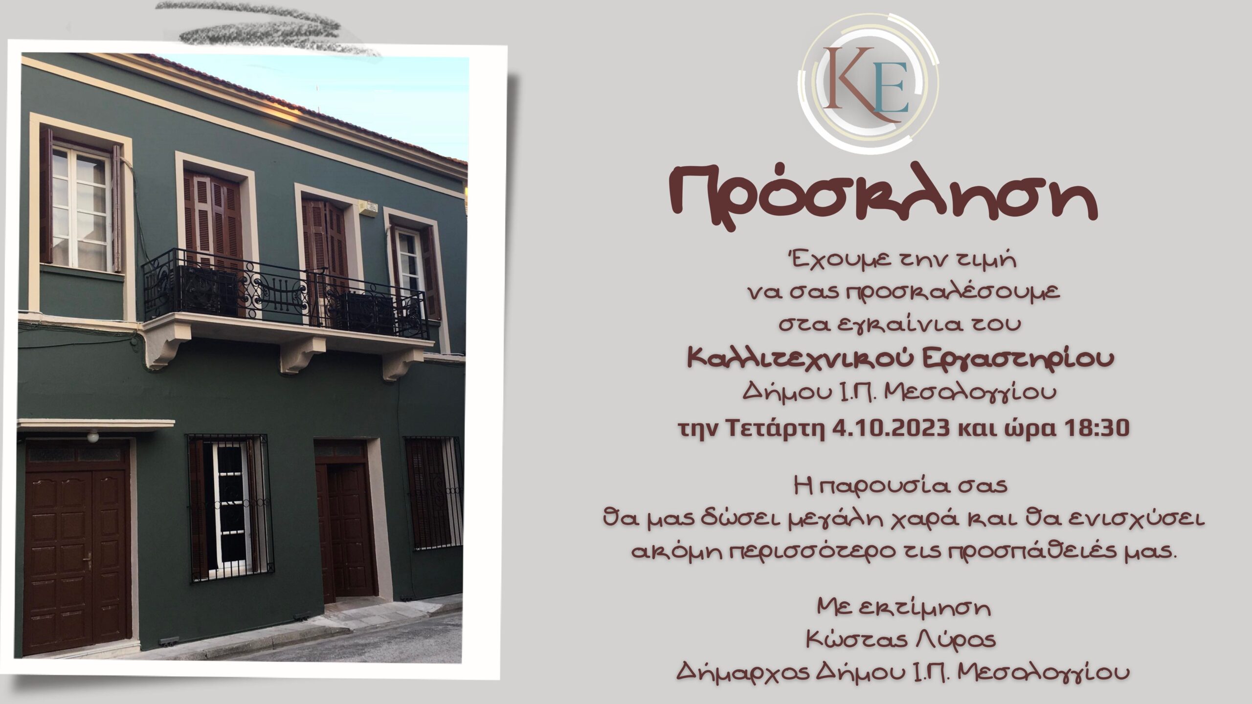 Την Τετάρτη 4 Οκτωβρίου 2023 και ώρα 18:30 στην οδό Φάβρου 3 στο Μεσολόγγι θα λάβουν χώρα τα εγκαίνια του πρωτότυπου Καλλιτεχνικού Εργαστηρίου του Δήμου Ι.Π. Μεσολογγίου.