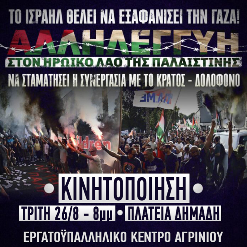 Το Εργατοϋπαλληλικό Κέντρο Αγρινίου καταγγέλλει την έναρξη της νέας δολοφονικής επιχείρησης του κράτους δολοφόνου του Ισραήλ όπου ετοιμάζεται να αποτελειώσει την γενοκτονία του Παλαιστινιακού με τον πιο φρικιαστικό τρόπο.