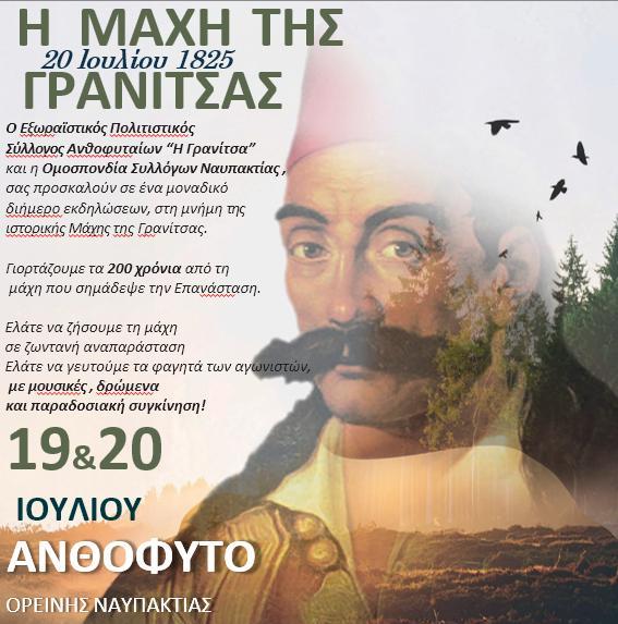 Ο Πολιτιστικός Σύλλογος Ανθοφυταίων η Γρανίτσα  υπό την αιγίδα της Ομοσπονδίας Συλλόγων Ναυπακτίας (Ο.ΣΥ.Ν) το Σάββατο  19 και Κυριακή 20 Ιουλίου 2025 θα διοργανώσουν εκδηλώσεις ιστορικής μνήμης  για τα 200 χρόνια από τη μάχη της Γρανίτσας .