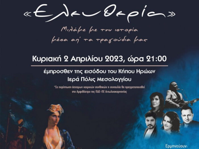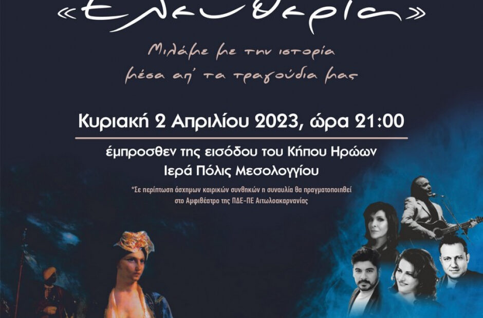 Αντίστοιχα, η συναυλία «Ελευθερία» που διοργανώνεται στο πλαίσιο των εορτασμών προς τιμήν της Εξόδου του Μεσολογγίου αποτελεί ένα μουσικό αφιέρωμα στον Απόδημο Ελληνισμό με σκοπούς τραγουδιών, εμπνευσμένων από τους αγώνες της πατρίδας για την υπέρτατη αξία της ελευθερίας. Η μουσική αυτή διαδρομή θα καλύψει την ιστορική περίοδο του 1821 έως και σήμερα. Πρόκειται για ένα ιδιαίτερο και ξεχωριστό μουσικό πρόγραμμα από καταξιωμένους καλλιτέχνες του ελληνικού πενταγράμμου, αλλά και ηθοποιούς στην αφήγηση ποιημάτων. Ειδικότερα ερμηνεύουν ο Λάκης Χαλκιάς , η Σοφία Βόσσου, η Μαρία Σουλτάτου, Κώστας Τριανταφυλλίδης, ο Γιώργος Αδαμόπουλος και η Παιδική Χορωδία Τυπάλδου υπό την καλλιτεχνική επιμέλεια και παρουσίαση του Γιάννη Τζουανόπουλου.