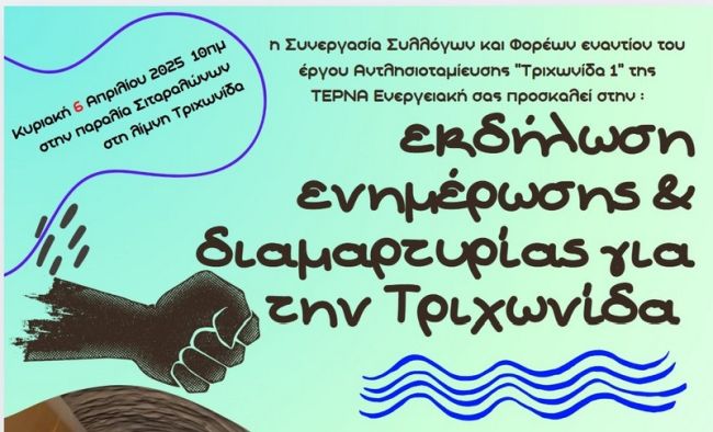 Η Συνεργασία Συλλόγων και Φορέων κατά του έργου αντλησιοταμίευσης «Τριχωνίδα Ι» μετά την κατάθεση επιστημονικά τεκμηριωμένου Δ11 στη διαβούλευση του ΥΠΕΝ και αναλυτικής Αναφοράς στο Ευρωπαϊκό Κοινοβούλιο, συνεχίζοντας την προσπάθεια για την οριστική ακύρωση του έργου, διοργανώνει εκδήλωση διαμαρτυρίας, ευαισθητοποίησης και ενημέρωσης, την Κυριακή 6 Απριλίου 2025, ώρα 10:00, στην παραλία Σιταραλώνων στη λίμνη Τριχωνίδα.