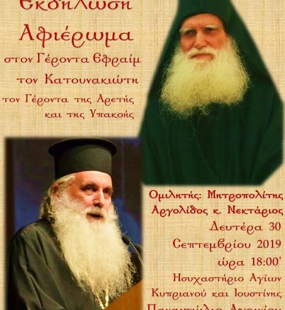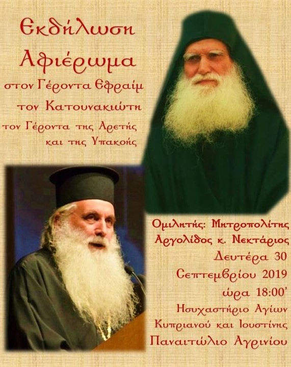 Την Δευτέρα 30 Σεπτεμβρίου 2019 και ώρα 18:00’, στο Ιερό Ησυχαστήριο των Αγίων Κυπριανού και Ιουστίνης που βρίσκεται στο Παναιτώλιο, θα πραγματοποιηθεί εκδήλωση – ομιλία αφιερωμένη στον Άγιο Γέροντα Εφραίμ τον Κατουνακιώτη.