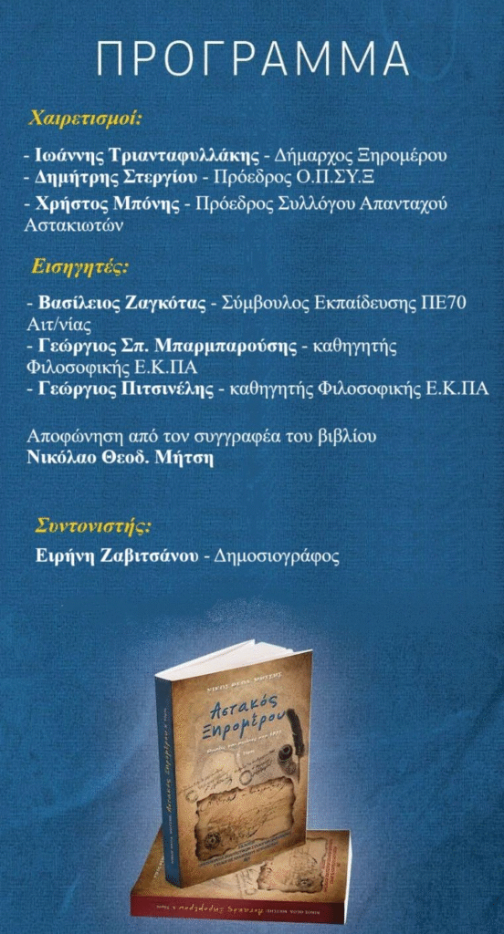 Οι διοργανωτές της εκδήλωσης (Σ.Α.Α. και ΟΠΣΥΞ) αποδέχθηκαν τα αιτήματα τους και σε συνεργασία με τον Δημο Ξηρομέρου πραγματοποιούν μια δεύτερη παρουσίαση την 21 η Αυγούστου στον Αστακο προσφέροντας την δυνατότητα τοσο στους κατοίκους του Αστακού και του Δήμου Ξηρομέρου οσο και γενικότερα του Νομού Αιτωλ/νιας να ακούσουν και να πληροφορηθούν από τις εισηγήσεις των παρουσιαστών ιστορικά στοιχεία για την περιοχή παράλληλα δε να αποκτήσουν το ιστορικό αυτό δίτομο έργο ,