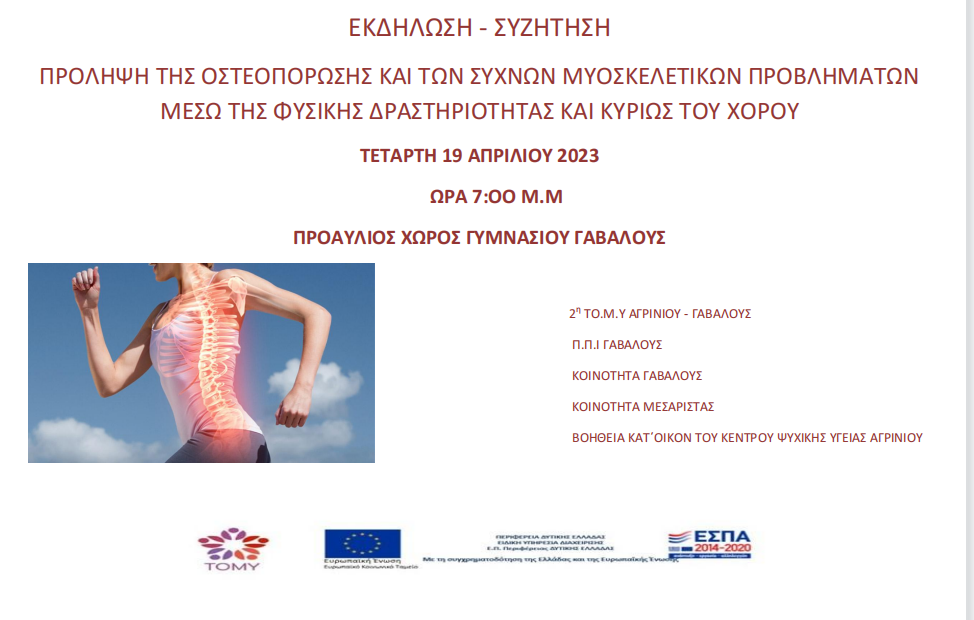 Σας προσκαλούμε στη δράση μας την Τετάρτη 19 Απριλίου 2023 και ώρα 7 μμ στον προαύλιο χώρο του γυμνασίου Γαβαλούς, Η θεματολογία θα αφορά στην πρόληψη της οστεοπόρωσης και άλλων συχνών μυοσκελετικών προβλημάτων μέσω της φυσικής δραστηριότητας και κυρίως του χορού. Συγκεκριμένα, η δράση θα περιλαμβάνει ομιλίες – παρεμβάσεις με θεματολογία: