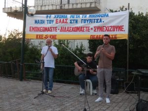 Η εκδήλωση έκλεισε με μικρό αφιέρωμα σε αντάρτικα τραγούδια από του μουσικούς, Σωτήρη Γκεβεντζέ, (τραγούδι), Ανδρέα Φούκα, (κιθάρα), Θανάση Μπλέτσα (κλαρίνο).