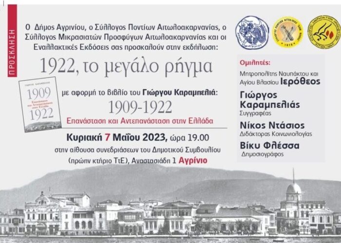 Ο Δήμος Αγρινίου, ο Σύλλογος Ποντίων Αιτωλοακαρνανίας, ο Σύλλογος Μικρασιατών Προσφύγων Αιτωλοακαρνανίας και οι Εναλλακτικές Εκδόσεις, σας προσκαλούν την Κυριακή 7 Μαΐου 2023 και ώρα 19:00, σε εκδήλωση με θέμα: “1922: Το μεγάλο ρήγμα”,  με αφορμή το νέο βιβλίο του Γιώργου Καραμπελιά “1909-2022, Επανάσταση και Αντεπανάσταση στην Ελλάδα”.