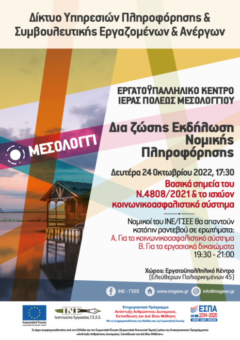 Το Ινστιτούτο Εργασίας της Γ.Σ.Ε.Ε.σε συνεργασία με το Εργατοϋπαλληλικό Κέντρο Ι.Π.Μεσολογγίουθα πραγματοποιήσει τη Δευτέρα 24 Οκτωβρίου 2022 με ώρα έναρξης 5:30 μ.μ., στην αίθουσα του Εργατοϋπαλληλικού Kέντρου (Ελεύθερων Πολιορκημένων 45), Εκδήλωση Νομικής Πληροφόρησης με θέμα: