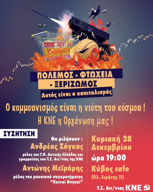 Η ΤΟ Αιτωλοακαρνανίας της ΚΝΕ διοργανώνει εκδήλωση – συζήτηση με θέμα «Πόλεμος – φτώχεια – ξεριζωμός, αυτός είναι ο καπιταλισμός! – Ο κομμουνισμός είναι η νιότη του κόσμου! – Η ΚΝΕ η Οργάνωσή μας!» την Κυριακή 28 Δεκέμβρη, στις 7 μ.μ., στο «Κύβος cafe» στο Αγρίνιο (πλατεία Ειρήνης 11).