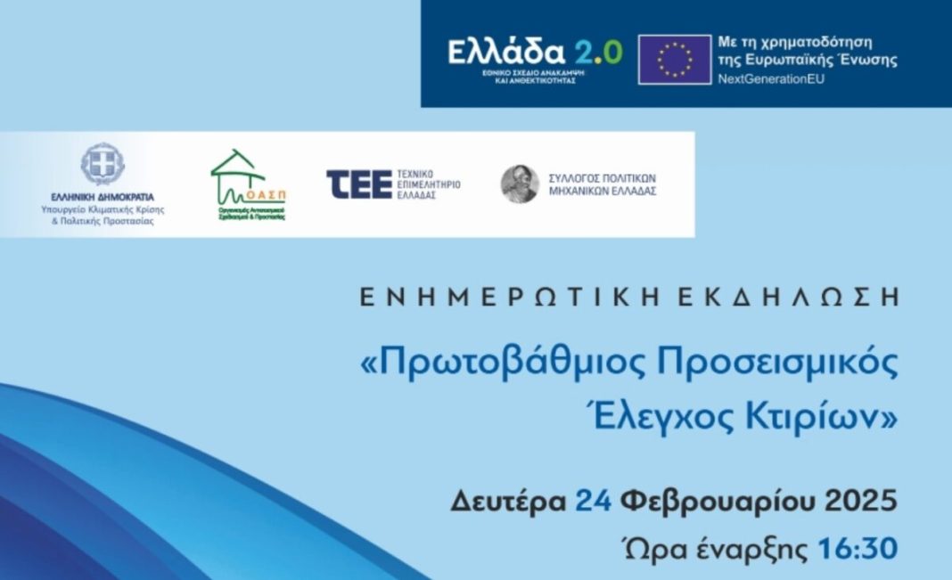 Ενημερωτική εκδήλωση με τίτλο “Πρωτοβάθμιος Προσεισμικός Έλεγχος Κτιρίων” πραγματοποιεί την Δευτέρα 24/02/2025 στο Μεσολόγγι το ΤΕΕ Αιτωλοακαρνανίας.