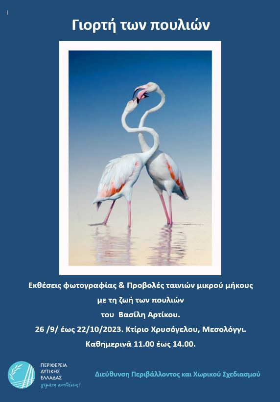 Η Περιφέρεια Δυτικής Ελλάδας και ο Αντιπεριφερειάρχης Ενέργειας, Περιβάλλοντος, Φυσικών Πόρων και Χωροταξίας, Λάμπρος Δημητρογιάννης, προσκαλούν το κοινό στην έκθεση φωτογραφίας με τίτλο «Γιορτή των Πουλιών», η οποία θα περιλαμβάνει και προβολή ταινιών μικρού μήκους με την ζωή των πουλιών, του καλλιτέχνη κ. Βασίλη Αρτίκου. Η έκθεση πραγματοποιείται στο Κτίριο Χρυσόγελου έως τις 22 Οκτωβρίου 2023, με ώρες επισκέψεων 11.00 έως 14.00, από τη Δεύτερα έως την Παρασκευή.