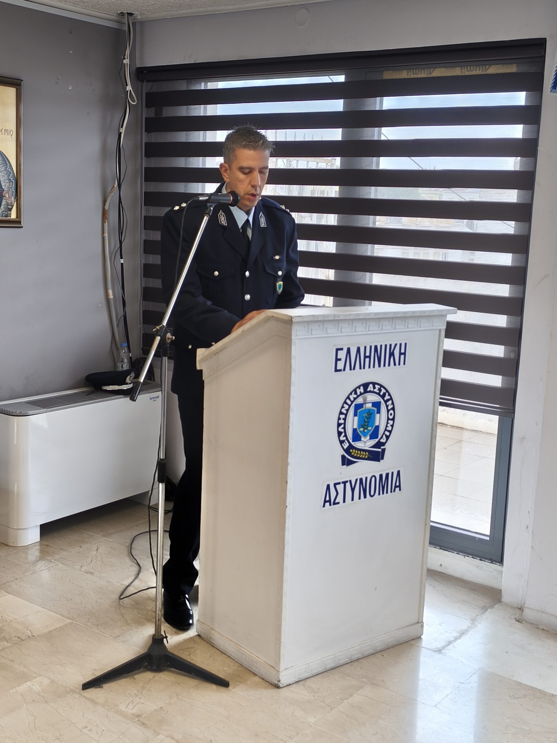 Η εκφώνηση του πανηγυρικού πραγματοποιήθηκε από τον Υπαστυνόμο Α’ Γεράσιμο Καούρη που υπηρετεί στο Επιτελείο της Διεύθυνσης Αστυνομίας Αχαΐας.