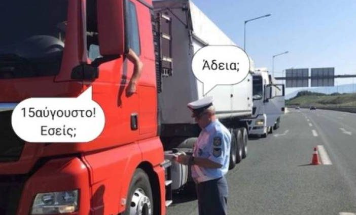 Στη φωτογραφία φαίνεται ο έλεγχος που γίνεται σε νταλίκα, με τον αστυνομικό να ρωτάει «άδεια;» και τον οδηγό να απαντά «15αύγουστο. Εσείς;».