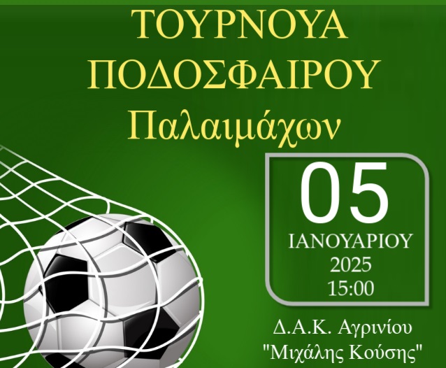 Tην Κυριακή 5 Ιανουαρίου και ώρα 15:00, οι παλαίμαχοι Παναιτωλικού υπό την αιγίδα του Δήμου Αγρινίου διοργανώνουν σε συνεργασία με τους βετεράνους Αθηνών, τους βετεράνους Κέρκυρας και τον Όμηρο Νεοχωρίου, τουρνουά ποδοσφαίρου στο Δ.Α.Κ. Αγρινίου “Μιχάλης Κούσης” και όχι στο γήπεδο ποδοσφαίρου Emileon όπως είχε οριστεί αρχικά λόγω προπόνησης της ομάδας.