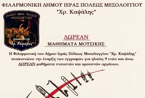 Η Φιλαρμονική του Δήμου Ιερής Πόλης Μεσολογγίου «Χρήστος Καψάλης» ανακοινώνει την έναρξη των εγγραφών για δωρεάν εκμάθηση πνευστών και κρουστών οργάνων, για παιδιά ηλικιών εννέα ετών και άνω.