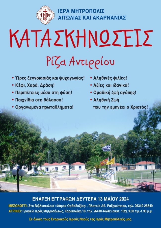 Από την Δευτέρα 1 Απριλίου 2025 ξεκίνησαν οι εγγραφές στις Κατασκηνώσεις της Ιεράς Μητροπόλεως Αιτωλίας και Ακαρνανίας στις παραθαλάσσιες εγκαταστάσεις της περιοχής Ρίζας Αντιρρίου.