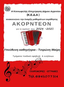 Η Κοινωφελής Επιχείρηση Δήμου Αγρινίου ανακοινώνει την έναρξη μαθημάτων εκμάθησης Ακορντεόν για το σχολικό έτος 2021 -2022