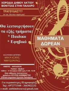 Το Κέντρο Κοινωνικής Μέριμνας και Ανάπτυξης του Δήμου Ακτίου Βόνιτσας ,στο πλαίσιο της διεύρυνσης και εμπλουτισμού των πολιτιστικών δραστηριοτήτων του Δήμου Ακτίου Βόνιτσας πραγματοποιεί την έναρξη της λειτουργίας Παιδικής-Εφηβικής Χορωδίας και στην Πάλαιρο