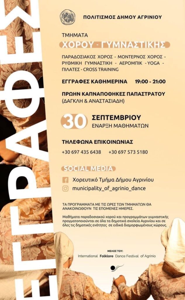 Το Τμήμα Πολιτισμού του Δήμου Αγρινίου ξεκινάει και φέτος τις δράσεις του με όρεξη και αγάπη για τη γυμναστική, τον χορό και την παράδοση.