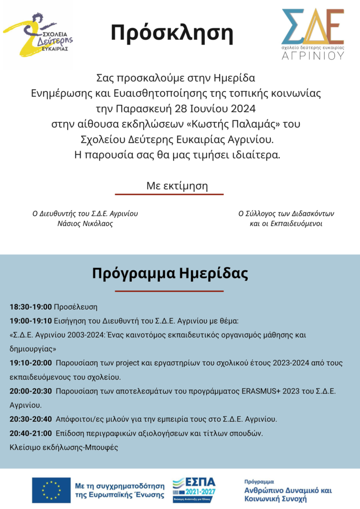 Ημερίδα του ΣΔΕ Αγρινίου με θέμα: “Πρόσκληση στην Ημερίδα Ενημέρωσης και Ευαισθητοποίησης της τοπικής κοινωνίας για τον καινοτόμο εκπαιδευτικό θεσμό του ΣΔΕ Αγρινίου “. Η Ημερίδα θα πραγματοποιηθεί σήμερα Παρασκευή 28 Ιουνίου 2024 ώρα 19:00