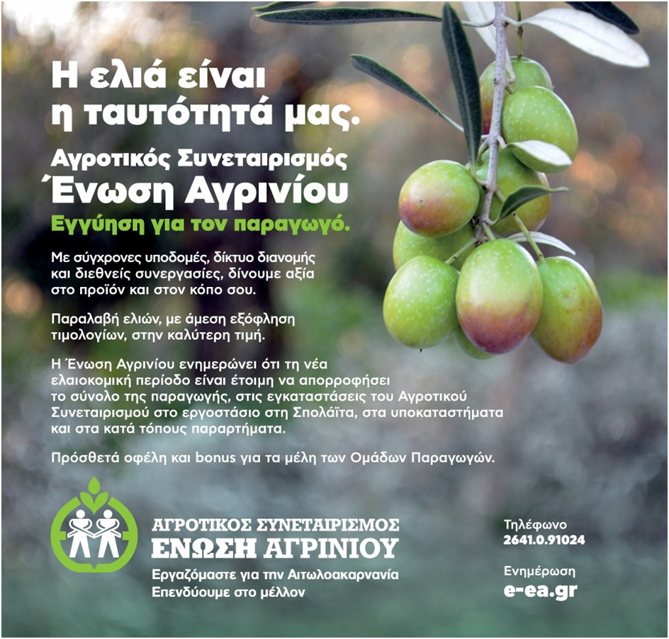 Η Ένωση Αγρινίου, με τις ισχυρές Ομάδες Παραγωγών και τις υποδομές της, όπως κάθε χρόνο δηλώνει έτοιμη για τη νέα ελαιοκομική περίοδο, τόσο σε ότι αφορά την απορρόφηση – παραλαβή της της επιτραπέζιας ελιάς όσο και σε ότι έχει να κάνει με την παράλληλη υποστήριξη στους ελαιοκαλλιεργητές, φυσικά παρέχοντάς τους και τα εφόδια που έχουν ανάγκη.