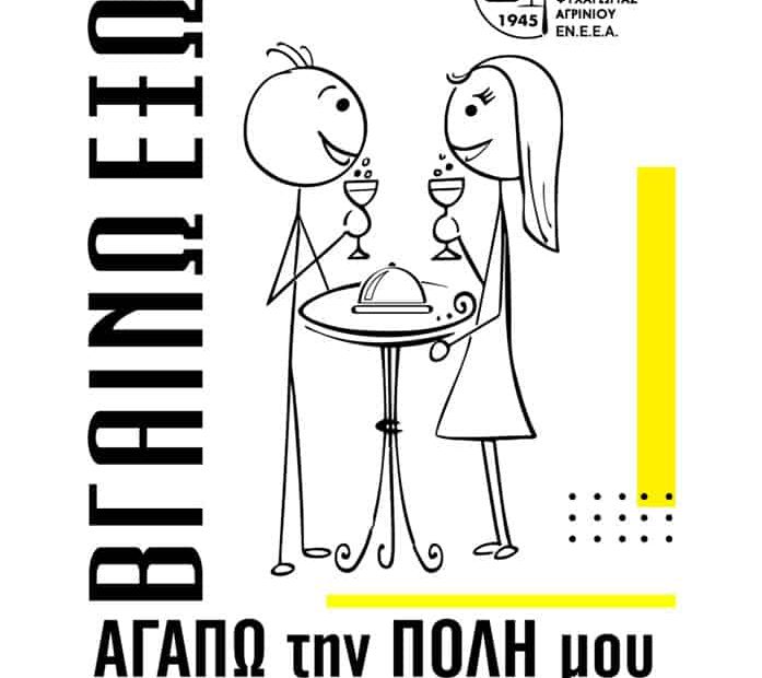 “Βγαίνουμε έξω” είναι το σλόγκαν της νέας καμπάνιας της Ένωσης Επαγγελματιών Εστίασης και Αναψυχής Αγρινίου με σκοπό η τοπική κοινωνία του Αγρινίου να στηρίξει τον κλάδο. Είναι υπόθεση όλων μας. Βγαίνουμε έξω για εμάς, για την πόλη μας και τη ζωή μας.