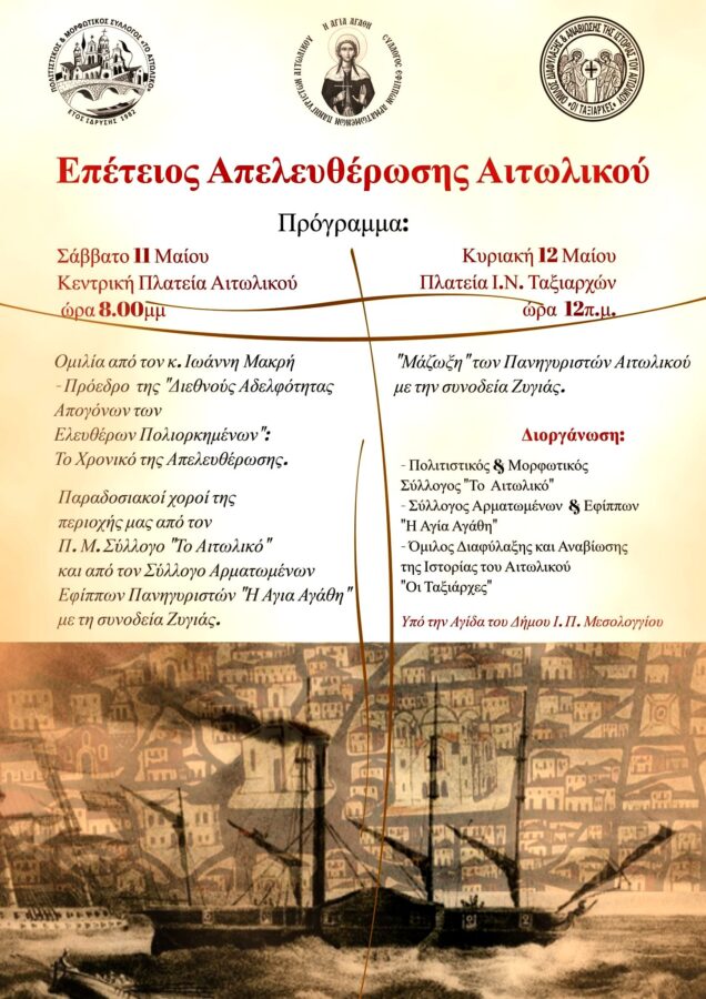 , ο Σύλλογος Αρματωμένων και Εφίππων Πανηγυριστών Αιτωλικού “Η Αγία Αγάθη” και οΌμιλος Διαφύλαξης & Αναβίωσης της Ιστορίας του Αιτωλικού ”Οι Ταξιάρχες”, διοργανώνουν και σας προσκαλούν, το διήμερο 11 και 12 Μαίου επετειακές εκδηλώσεις της Απελευθέρωσης του Αιτωλικού.