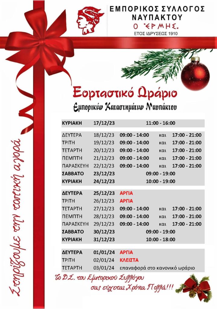 Εορταστικό ωράριο των Εμπορικών καταστημάτων Ναυπάκτου για τη περίοδο των Χριστουγέννων