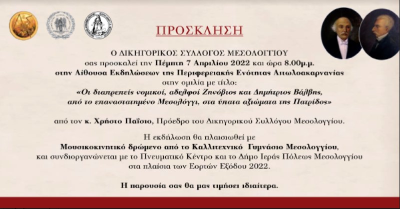 Ο Δικηγορικός Σύλλογος Μεσολογγίου προσκαλεί σε εκδήλωση με θέμα «Οι διαπρεπείς νομικοί, αδελφοί Ζηνόβιος και Δημήτριος Βάλβης, από το επαναστατημένο Μεσολόγγι, στα ύπατα αξιώματα της Πατρίδος».