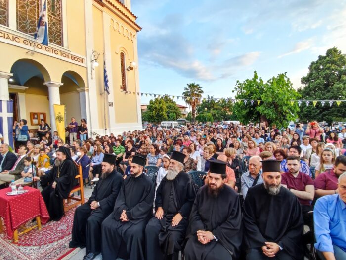 Ο Σεβασμιώτατος, κατά τον χαιρετισμό του, ανέφερε μεταξύ άλλων: «Ταξιδέψαμε στο ένδοξο παρελθόν μας, στην ευλογημένη ιστορία αυτού του τόπου. Ζωντάνεψαν μπροστά μας οι ήρωες, μέσα από το πανέμορφο θεατρικό. Ακούσαμε την ιστορία μας, όπως μας την παρουσίασαν οι δύο αφηγήτριες και ξαναζωντάνεψε μέσα τα παραδοσιακά μας τραγούδια, μέσα στα οποία έμεινε ζωντανή η ιστορία μας και τα κατορθώματα των ηρώων της. Η ιστορία και ο πολιτισμός αυτό διακονούν, να παραμείνει ζωντανή η εθνική μας συνείδηση και ταυτότητα. Αυτή άλλωστε είναι και η δική μας ευθύνη, να μη λησμονήσουμε τις θυσίες των προγόνων μας, να μην ξεχάσουμε όλους αυτούς που αγωνίστηκαν για να μπορούμε εμείς σήμερα να απολαμβάνουμε το αναφαίρετο δικαίωμα της ελευθερίας. Αυτός ο τόπος, αυτή η πόλη έχει βαθιά ριζωμένες στο παρελθόν θυσίες ηρώων μεγάλων, που παρέμειναν ελεύθεροι μέσα στα χρόνια της σκλαβιάς, αδούλωτοι στο φρόνημα, χάρη στον πατρο-Κοσμά, τον διαπρύσιο αυτό κήρυκα της εθνικής και πνευματικής μας ελευθερίας».