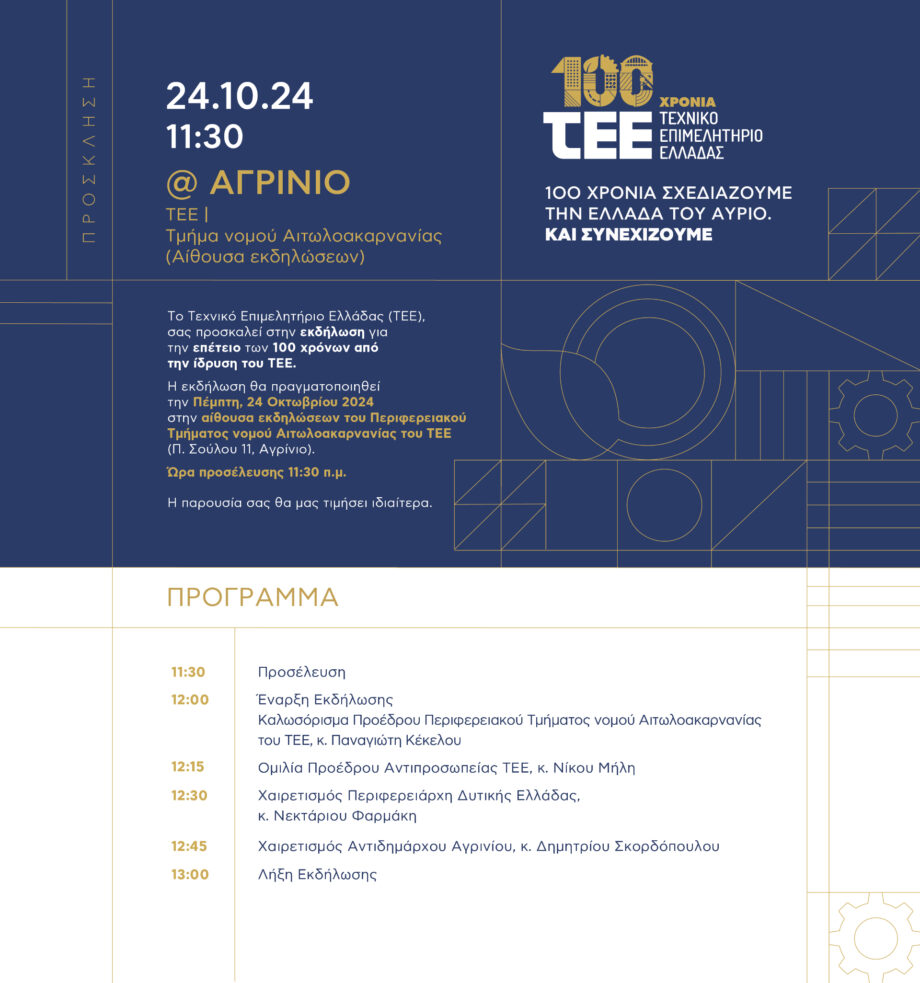 Με την παρούσα επιστολή, σας προσκαλούμε να παρευρεθείτε στην επετειακή εκδήλωση για τα 100 χρόνια του ΤΕΕ , που θα πραγματοποιηθεί , την Πέμπτη, 24 Οκτωβρίου, και ώρα 12:00, στην αίθουσα εκδηλώσεων του Τμήματος Πάνου Σούλου 11, Αγρίνιο