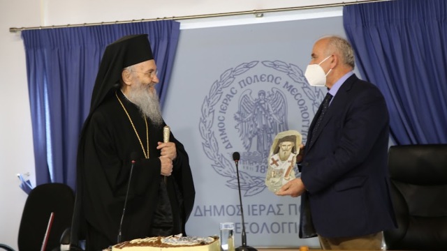 Κατόπιν ο Σεβασμιώτατος επισκέφθηκε τον Δήμο Ιεράς Πόλεως Μεσολογγίου, όπου ευλόγησε και έκοψε την βασιλόπιτα των υπαλλήλων του Δήμου, παρουσία του Δημάρχου κ. Κωνσταντίνου Λύρου.