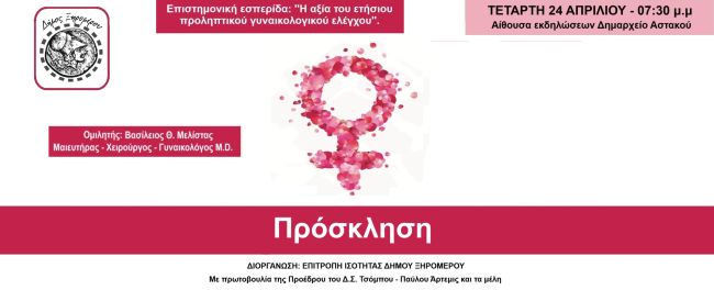 Σας προσκαλούμε στην επιστημονική εσπερίδα: “Η αξία του ετήσιου προληπτικού γυναικολογικού ελέγχου” την Τετάρτη 24 Απριλίου – 07:30 μ.μ., στην αίθουσα εκδηλώσεων στο Δημαρχείο Αστακού.